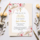 A white arch frame and a soft beige, peach coloured background. Decorated with pink flowers and pin bows. A golden cross. Personalise and add a name and details.