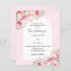 A white arch frame and light pink background. Decorated with pink flowers and pink bows. Personalise and add your names and details.