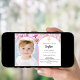 Add your own vertical size photo. A pink arch shaped photo frame. Decorated with pink flowers and a golden cross. Personalise and add a name and details.