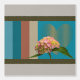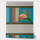 The design features abstract fine art of shades of aqua blue, grey, stone brown, and grey colours along with golden hearts and pink hydrangea flowers - all presented in an elegant striped geometric pattern.