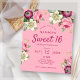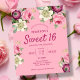 Customisable affordable paper 16th birthday invitations featuring pretty watercolour roses, anemones and clematis on a pink background.