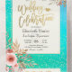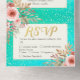 Modern Wedding Invitation with Detachable RSVP Postcard Template - Elegant Lettering Script and Vintage Watercolor Pink Flowers on Turquoise Teal Blue Green and Faux Gold Foil Confetti Polka Dots Background.
