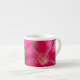 Espresso in the garden - the original photograph by MaeFlowers on this brightly coloured Espresso Cup is a closeup of pink flowers against green leaves, with a touch of light blue sky showing through. In the photo, the flower petals are wide open. The flower's centre is a soft yellow ivory blending into pink at its ruffled outer edges.