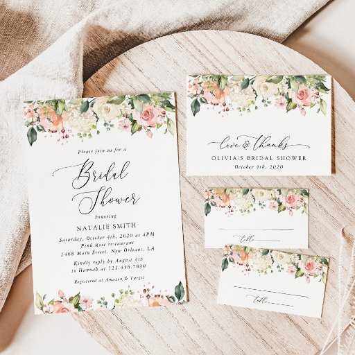 Add a personal touch to your bridal shower celebration with these stylish and memorable recipe cards! Design features pink and white watercolor flowers and greenery on white background.