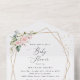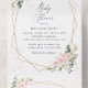Invite friends and family in style and set the tone for your special day with this charming baby shower invitation. Design features pink and white watercolor flowers, greenery, gold confetti and gold frame on white background.