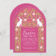 Hop into Easter with a brunch to remember! This invite features a charming arch-shaped frame filled with florals and playful white rabbits against a pink background. Perfect for a festive gathering! Personalize it to meet your needs.