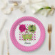 Pink Frog 1st Birthday paper plates are fun, colourful, great for girls who love frogs! Features a cute green frog wearing a polka dotted party hat, green and hot pink dots, balloons of pink and green that read I'm 1, and a wide border of pink on pink polka dots. You can easily add the first birthday child's name to personalise these frog theme paper plates. Look for the matching napkins, T-shirts, buttons, bags, and more!