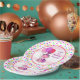 Pink and purple candy sprinkles and frog holding balloon's girl's birthday paper plates.