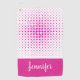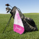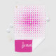 A geometric pattern golf towel done in squares of pink and white with blue and green accents. A pink band, across the bottom of the golf towel has custom white text ready to personalise.
