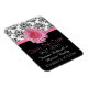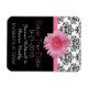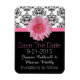 Lovely black and white wedding save the date magnet, with an elegant damask pattern, on top, and solid black, on the bottom. Graphics of a pink ribbon, with a pink Gerber daisy between the two backgrounds. Pink and white text is ready to personalise with your information. Pretty way to announce your up coming wedding plans to out of town guests and family.