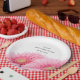 Paper plates with a photograph of a pair of pink gerbera daisies. Elegant & stylish.