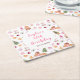 This elegant and festive coaster features a watercolor gingerbread house, gingerbread train, cake stand, cookie jar, hot cocoa, pink poinsettia flowers and Christmas trees. The text combines handwritten script and sans serif fonts for a stylish and modern look. This is perfect for Christmas birthday parties.