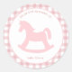 Baby pink gingham check personalised "from the nursery of" envelope seal with cute rocking horse silhouette.