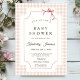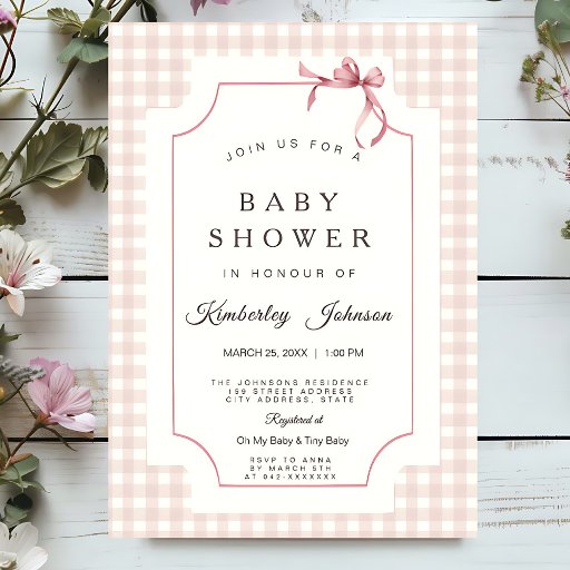 Celebrate the upcoming arrival of a little giirl with this charming baby shower invitation, featuring a classic pink gingham border and back, elegant, grey script fonts, and a sweet watercolor bow at the top. Perfect for a country-style celebration, this invitation is both warm and stylish. Customise the text for your event details and create a keepsake-worthy invite that guests will adore.