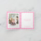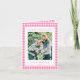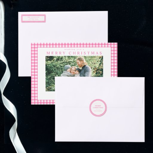 Create your own custom photo Christmas cards featuring two of your favorite family pictures alongside personalized minimalist typography name and year on a cute pink gingham plaid pattern background.