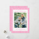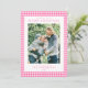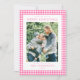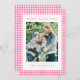 Create your own custom photo Christmas cards featuring one of your favorite family pictures alongside personalized minimalist typography name and year on a cute pink gingham plaid pattern background.