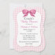 Stylish couple's bracket shaped baby shower invitation done in a light pink and white gingham checked pattern. Graphics of a pink outlined white text area, in the middle, has a pretty rose pink bow, at the top. The backside is done in the same gingham pattern. Personalise all the text to suit your event needs.