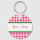 A keychain featuring a background of Pink gingham with green trim. Personalise with your name in centre section.