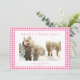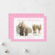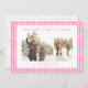 Create your own custom photo Christmas cards featuring two of your family pictures alongside personalized minimalist typography name and year on a cute pink gingham plaid pattern background.