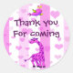 Giraffe illustration in pink colour thank you stickers design, A beautiful and unique design with a pink and white, hearts background. The design can be fully customised with your details.
