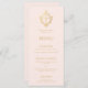 Above the text, there is a cross in a vintage crest, both in faux gold foil. The title "Menu" and the subtitles are written in caps. All text can be personalised and has a golden colour similar to the rose gold crest. The background is blush pink. On the back, there is the same cross in crest.