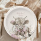The design showcases the cute Highland cow with its signature shaggy fur, set against a soft pastel backdrop adorned with floral accents. Perfect for a gender-neutral or boy-girl party, these plates effortlessly complement a farm animals theme while bringing a rustic and playful flair to the table.