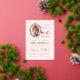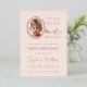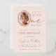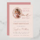 The O in One is an oval floral frame with the photo of the little girl in it. The rest of the word One and the name are written in script.