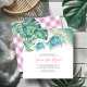 The back of the card includes a coordinating pink gingham pattern with tropical leaf accents for an extra dose of charm. These kids birthday invitations are available as templates you can easily personalise with your event details.