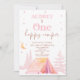 Girls camper themed first birthday invitation featuring a watercolor tent, pink silhouette pink trees, moon, stars and a modern calligraphy heading. This happy camper first birthday invitation is ideal for a camping themed first birthday for a baby girl.
