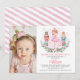 Cute Sugar Plum Fairy birthday invitation for a little girl featuring a pink dressed fairy, two nutcrackers, a floral arrangement, some snowflakes and your little girl's photo on the left. Great for a Sugar Plum Fairy birthday party.