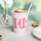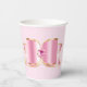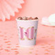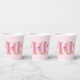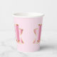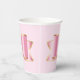 Paper cups with a glitzy shiny bow with gold outline and a faceted pink gemstone in the centre. Feminine luxury glam style.