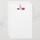 Stationery paper with a glam style design. Hot pink lipstick and nail polish. The nail polish bottle is open, laying on its side, with drips of nail polish coming out.