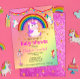 This cute and colorful pink baby shower announcement features an adorable little pink unicorn sitting in front of a glittering rainbow with colorful rainbow bunting and flags overhead. All around are gold stars, more unicorns, balloons, unicorn cake and baby shower gift box. On the back there is a pattern of (faux) pink glitter. All personalized details can be changed above. 🦄