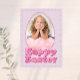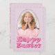 This custom greeting card features a cute and glamourous Easter theme. A pink glitter and foil design egg frame is placed in the centre with a sample photo that you can personalise to include your own custom photo or image. A "Happy Easter" greeting is printed below in a hot pink bubbly font.