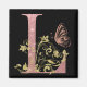 Pretty pink glitter initial / letter L with gold leaves and swirls and coppery butterfly overlay on black background