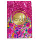 Pink Glitter Golden Metal Frame Floral Monogrammed Medium Gift Bag