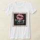 A t-shirt with a background composed with a modern trendy rose gold tropical leaves pattern. Layered over top is a black frame with a gold gradient border, inside are pink glittery lips. Personalise with your name and business number.