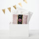 Favour bag with a background composed with a modern trendy rose gold tropical leaves pattern. Layered over top is a black frame with a gold gradient border, inside are pink glittery lips.