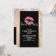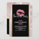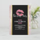 Bachelorette part invitation with a background composed of modern trendy rose gold tropical leaves. Layered over top is a black frame with a gold gradient border, inside are pink glittery lips.