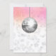© Socialite Designs Inc. & LICENSORS. Celebrate a disco birthday party by inviting the guests with this fun, retro disco birthday party invitation. Colours are silver, white, hot pink glitter and grey. The design incorporates a silver disco ball and white string lights, with bokeh as a background.
