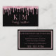 This stylish business card features a glamourous, girly, design on a black background. Light pink glitter sequins are dripping across the top portion. Monogram initials are placed beneath the glitter, followed by a sample name printed in an elegant script font. The back of the business card features the contact information and a soft pink glitter frame.