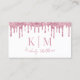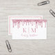 This stylish business card features a glamourous, girly, design on a white background. Light pink glitter sequins are dripping across the top portion. Monogram initials are placed beneath the glitter, followed by a sample name printed in an elegant script font. The back of the business card features the contact information and a soft pink glitter frame.