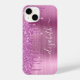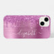Custom elegant and girly iPhone case featuring dripping pink faux glitter on a pink faux brushed metallic background. Personalise with your name in a stylish trendy white script with swashes.