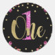 Pink Glitter ONE Black Floral 1st Birthday Party Classic Round Sticker