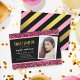 Pink Glitter Photo Birthday Party Invitation features the words "Sweet Sixteen" in a fun sans serif font in faux gold foil with a pink glitter top and bottom and a black centre background on the front. Invitation has a pink, black and faux gold foil stripes pattern back side.