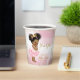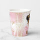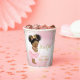 Princess baby shower paper cups with adorable African American princess baby girl with cute afro puff hair, crown and tutu on a pretty pink and gold glitter background. These princess baby shower paper cups are easily personalised for your event by adding the text of your choice. You can delete the it's a girl graphic.