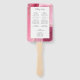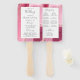 This elegant, modern wedding program fan features a pink agate background trimmed with gold faux glitter. The text appears in elegant charcoal grey handwriting and copperplate fonts on a white rectangle.