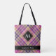 Pink, golden yellow and blue tartan design. Seamless pattern. Custom text and monogram.