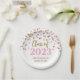 Customisable graduation party class of 2023 plates in glamourous gold and pink confetti pattern and elegant hand lettered style text.