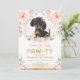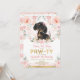 Celebrate your little girl's birthday with this beautiful invitation featuring an adorable dachshund puppy surrounded by gorgeous blush pink flowers and delicate watercolor greenery